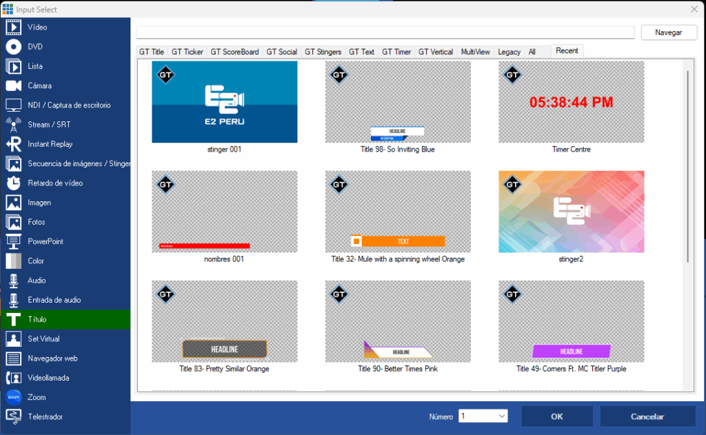 Una vez terminado el diseño, guarda el archivo. Luego, regresa a vMix, ve a añadir entrada, selecciona Título, y en la pestaña de Recientes encontrarás tu diseño listo para usar.