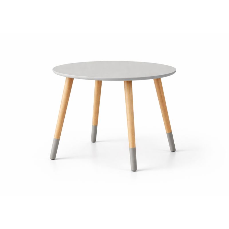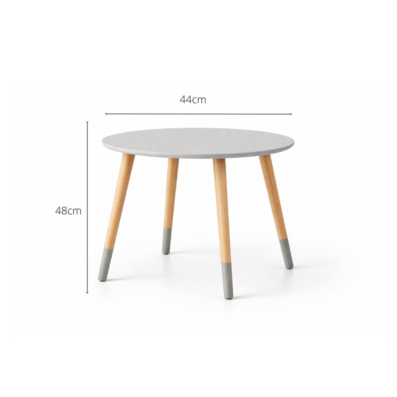 Mesa de centro pequeña color gris con patas de madera. Diseño minimalista y moderno.