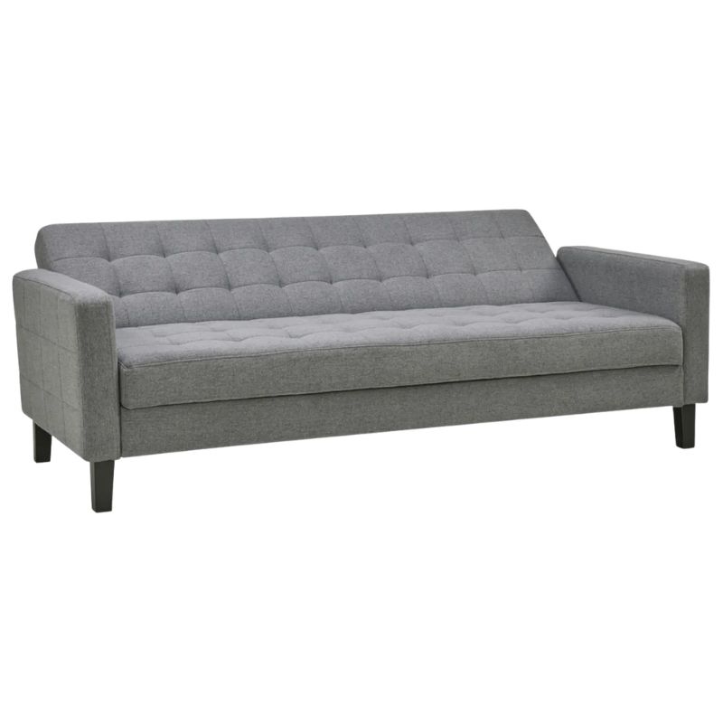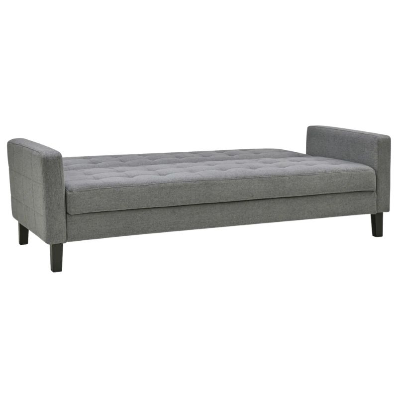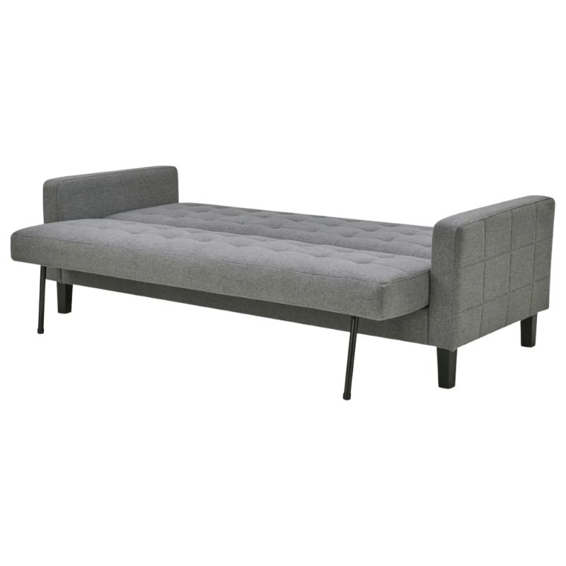 Sofá cama gris moderno, ideal para utilería en sets, eventos o ambientaciones. Diseño cómodo y versátil.